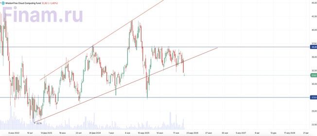 Акции WCLD на недельном графике пробили вниз нижнюю линию глобального тренда, который длился 2 года. Такое уже случалось в апреле 2025-го, поэтому текущий пробой также может быстро вернуться в трендовые значения. В целом техническая картинка смотрится нейтрально, однако показатель RSI равен 25 пунктам, что говорит о колоссальной перепроданности, так что отскок вверх является очень вероятным. Если пробой подтвердится, фонд сформирует новое боковое движение в границах $27,5–37,0. Диапазон весьма широкий, но данный фонд очень волатилен за счет специфики облачного и AI-секторов.