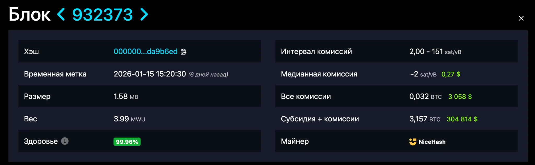 Блок содержал 2581 перевод. Комиссии за транзакции достигли 0,032 BTC ($3058) и были зачислены на счет добытчика. Он тоже работал на оборудовании NiceHash.