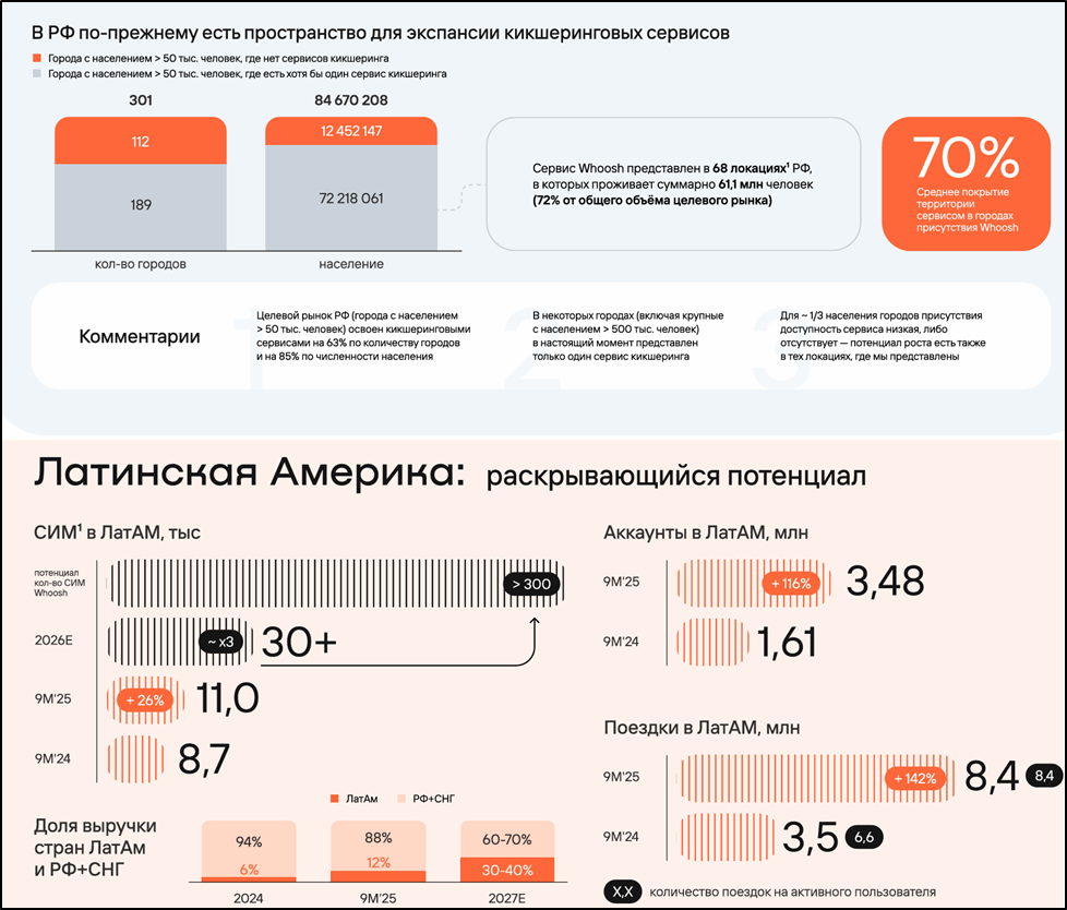 Whoosh видит потенциал роста бизнеса. В РФ среднее покрытие 70% от целевого рынка. А в Латинской Америке рост еще может быть кратный.