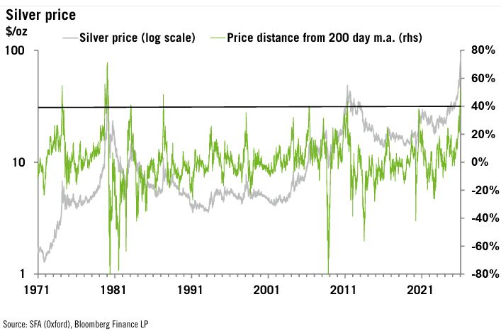 Ралли цен на серебро стало самым экстремальным с 1980 года, когда братья Хант пытались монополизировать рынок. 23 января, когда цена серебра поднялась выше $ 100 за унцию, она была на 54% выше своей 200-дневной скользящей средней (MA 200). В 1980 году цена серебра на пике была более чем на 70% выше своей MA 200. В 1974 году цена также поднялась на 54% выше своей MA 200, прежде чем произошла коррекция (падение от пика до минимума на 44%), но затем ралли продолжилось в 1980 году.