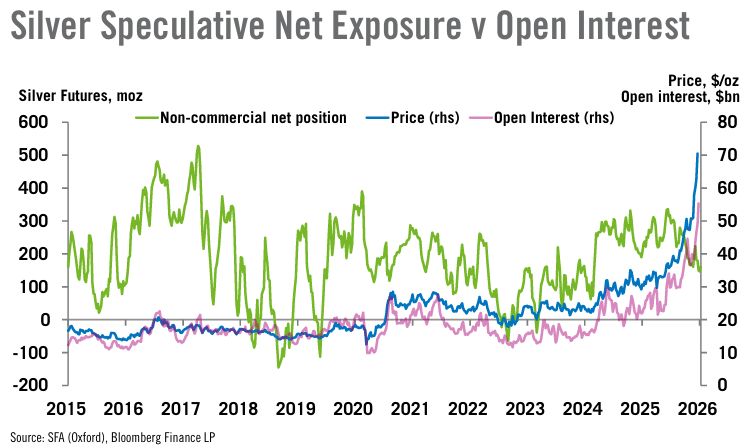 С технической точки зрения, это ралли выглядит очень затянувшимся. Дневной индекс относительной силы (RSI) остаётся выше 70, сигнализируя о перекупленности, хотя в настоящее время наблюдается дивергенция, поскольку RSI был значительно выше на пике более низкой цены в конце декабря. Спекулятивная чистая длинная позиция по фьючерсам на COMEX продолжала расти в течение января, увеличившись со 146 млн до 160 млн унций за неделю. Тем не менее, позиции остаются значительно ниже экстремальных значений, наблюдавшихся в 2025 году, когда нетто лонги спекулянтов достигали пика около 300 млн унций, что говорит о наличии потенциала для дальнейшего вовлечения инвесторов.