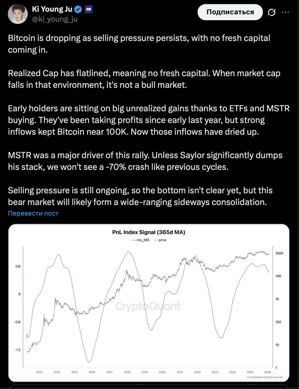 Генеральный директор сервиса аналитики CryptoQuant Ки Ён Джу убежден: если Strategy начнет распродажу своего запаса биткоинов, чтобы не уйти в больший убыток, возможен глубокий обвал первой криптовалюты — даже на 70%. Ки Ён Джу обращает внимание, что приток новых денег инвесторов в биткоин практически остановился. Хотя крупные долгосрочные держатели типа Strategy накопили значительную нереализованную прибыль, они все же начали ее фиксировать. Поскольку это совпало с резким замедлением спроса, текущий спад завершится не быстрым отскоком, а длительным периодом бокового движения цены BTC, полагает аналитик.