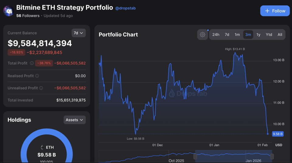 Стоимость запаса крупнейшего корпоративного держателя эфиров BitMine составляет около $9,6 млрд, согласно данным Dropstab. Для сравнения, в октябре стоимость запаса достигла пиковых $13,9 млрд. На прошлой неделе BitMine приобрела дополнительно 40 302 ETH, в результате чего общий объем резервов превысил 4,24 млн эфиров.