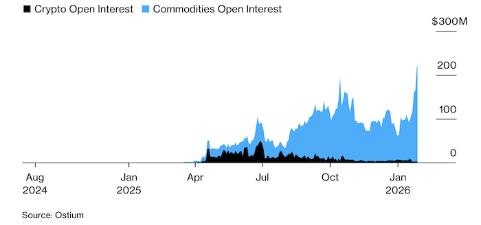 На криптоплатформах вроде Hyperliquid основной объем торгов по-прежнему формируют нативные токены и мемкоины. Однако именно здесь появились признаки более широкого макросдвига. Так, за одни сутки на этой неделе объем торгов фьючерсами на серебро на Hyperliquid превысил $1 млрд — в четыре раза больше, чем у второго по популярности контракта, привязанного к фондовому индексу. На конкурирующей бирже Ostium сырьевые товары — в основном бессрочные фьючерсы («перпы») на золото и серебро — теперь формируют около 80% открытого интереса.
