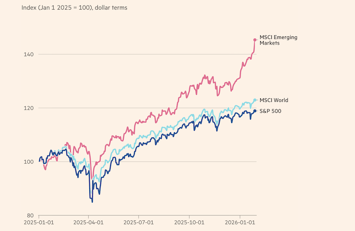 Акции, облигации и валюты развивающихся рынков показывают уверенное начало 2026 года. Ослабление доллара до четырехлетнего минимума подтолкнуло инвесторов диверсифицировать портфели за пределы США и активнее присматриваться к рынкам с более привлекательными базовыми факторами.