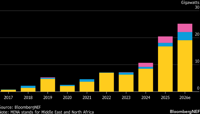 Основной рост здесь будет обеспечен крупными проектами, реализуемыми в Саудовской Аравии, ОАЭ и Египте. Страны MENA активно наращивают генерацию «зеленой» электроэнергии, стремясь сократить потребление ископаемого топлива и стать стратегическим хабом для энергоемких отраслей промышленности, пишут аналитики BloombergNEF.