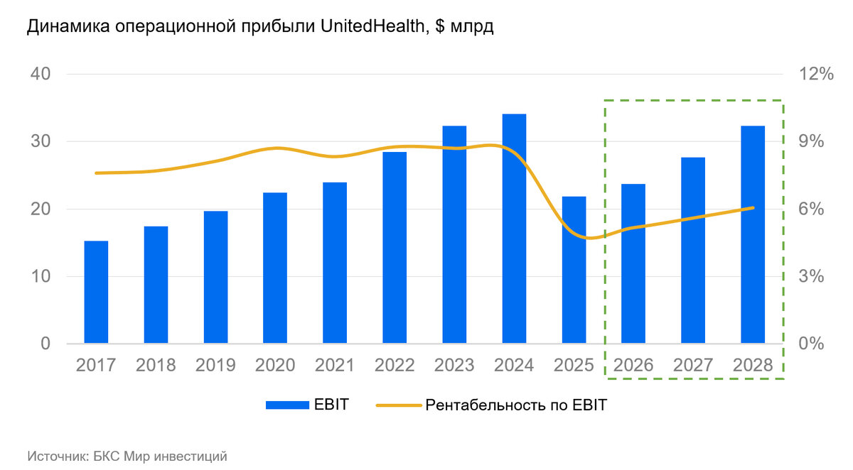 - Первый выход из спада. UnitedHealth первой начала пересмотр тарифов в Medicare Advantage и оптимизацию продуктового портфеля. Благодаря повышению ставок CMS на +5% в 2026 г. компания первой в секторе вернется к росту маржи и EPS.