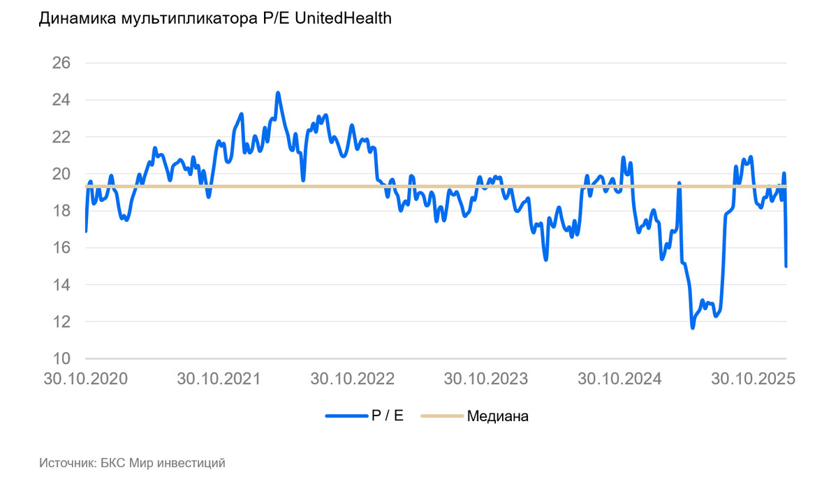 Оценка акций UnitedHealth сейчас выглядит привлекательно. На данный момент бумаги торгуются с P/E около 15,7x, примерно на 20% ниже среднего значения за последние пять лет. На наш взгляд, этот уровень уже отражает значительную часть регуляторных и операционных рисков, связанных с ростом медицинских затрат и неопределенностью по тарифам Medicare Advantage.
