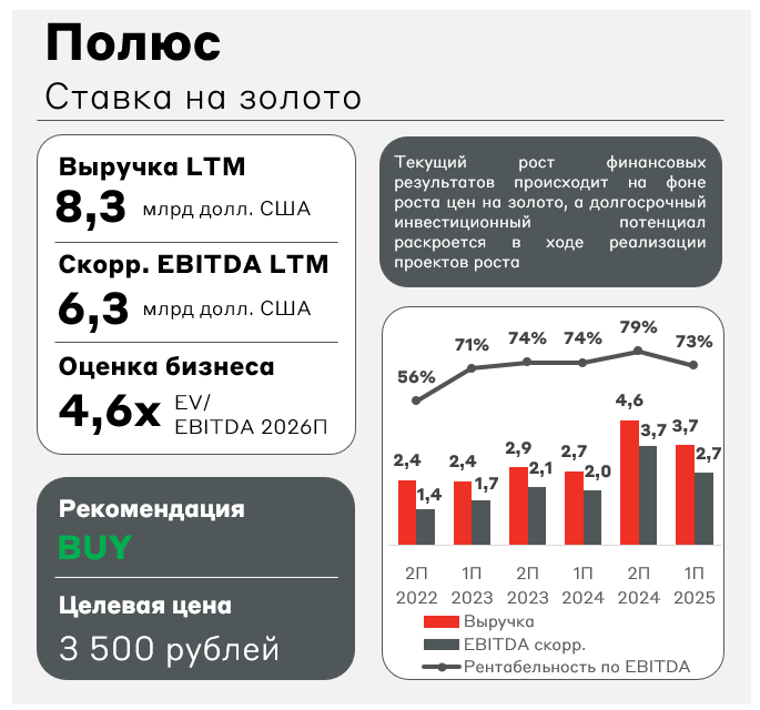На фоне благоприятной ценовой конъюнктуры на мировом рынке золота Полюс показывает сильные финансовые результаты. Благодаря своей операционной эффективности компания сохраняет позиции одного из лидеров глобальной золотодобывающей отрасли с объёмом добычи порядка 2,5 млн унций в год.