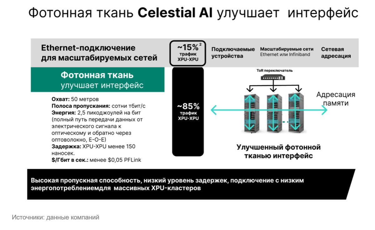 Покупка CelestialAI нацелена на продвижение решений инновационных оптических коммуникаций, прежде всего, внутри стойки (между процессорами и микросхемами памяти. Разработанная компанией технологическая платформа Photonic Fabric для масштабируемых оптических соединений позволит осуществить перевод высокоскоростных каналов XPU с медных на оптические. Так, уже первое поколение чипа объединяет все необходимые электрические и оптические компоненты в компактном форм-факторе.