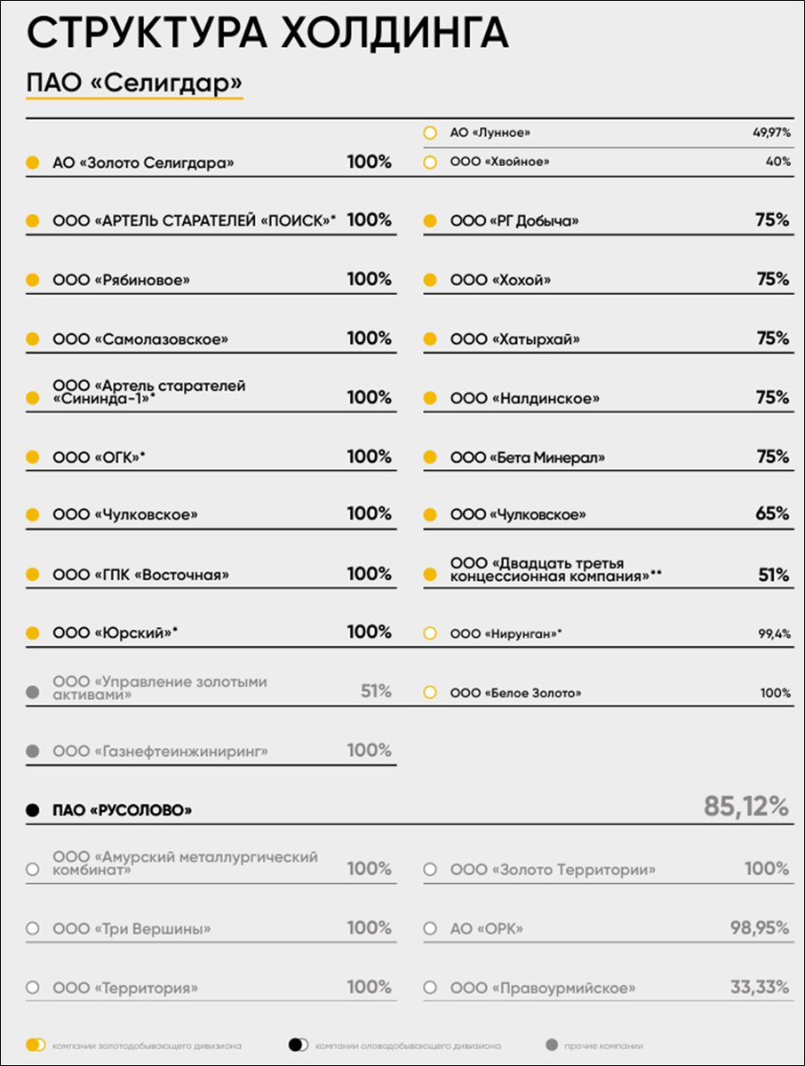В структуре холдинга выделяется два основных дивизиона: золотодобывающий и оловодобывающий. В рамках последнего еще добывается медь и вольфрам. Селигдар владеет 85% акций компании Русолово, которая также представлена на Мосбирже.