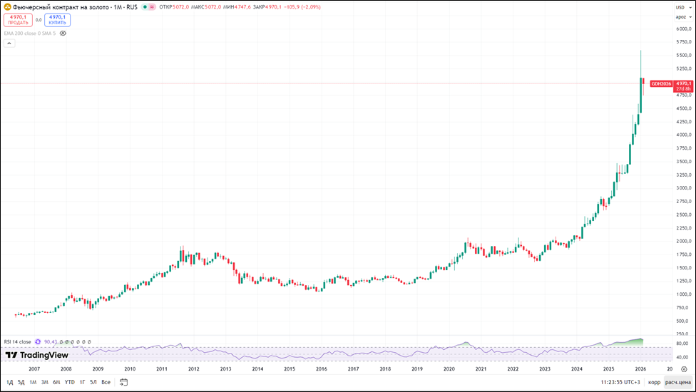 В 2024 году золото пробило многолетние уровни сопротивления, с тех пор начался безудержный рост. За 2025 год котировки выросли более, чем в 1,5 раза. А с начала 2026 года рост более 10%. Правда, с конца января началась коррекция, и с недавних исторических максимумов золото снизилось примерно на 10%. Текущая цена в районе 5000 долларов за унцию.