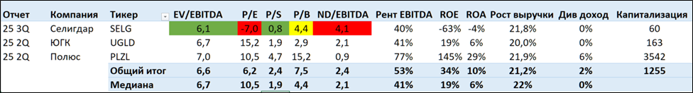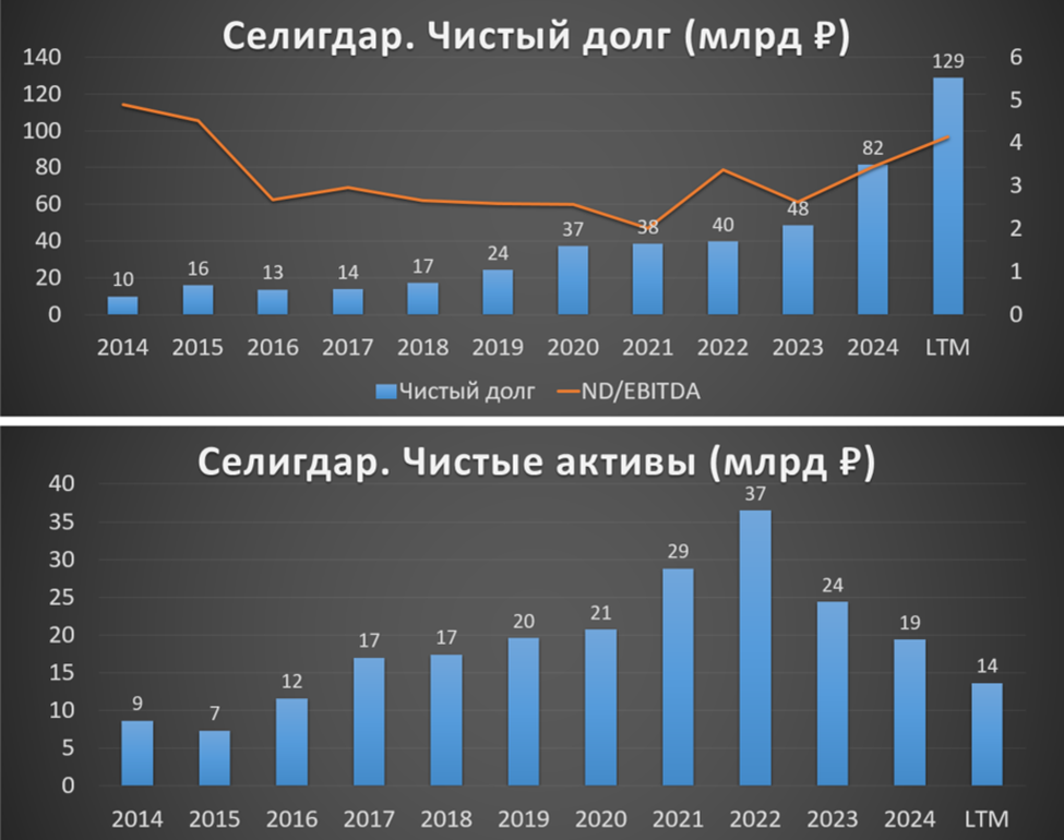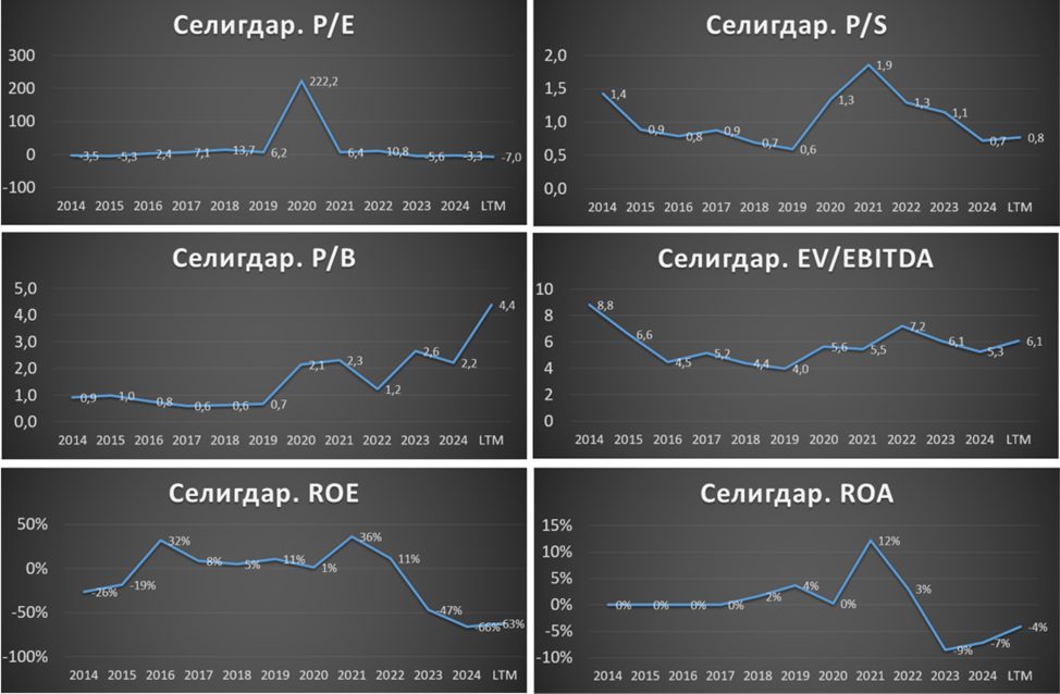 Относительно конкурентов смотрится средне, при этом, капитализация Селигдара самая низкая, а долговая нагрузка самая высокая.