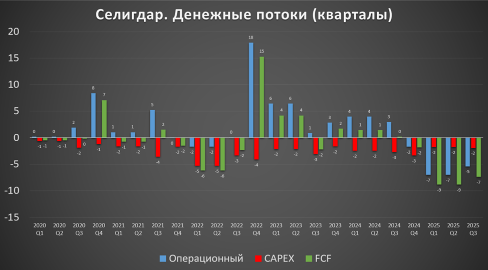 Результаты 3Q 2025 рекордные в части выручки и EBITDA. Но несмотря на это, уже 13 кварталов подряд компания отражает убытки. Правда, это в основном из-за бумажных курсовых разниц, и если их учитывать, то по итогам года Селигдар неизменно с положительной скорректированной ЧП.