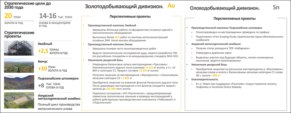 Добыча золота ведётся в Якутии, Алтае и Бурятии. Добыча олова - в Хабаровском крае. Перспективные проекты расположены в Оренбургской области и в Чукотском автономном округе.