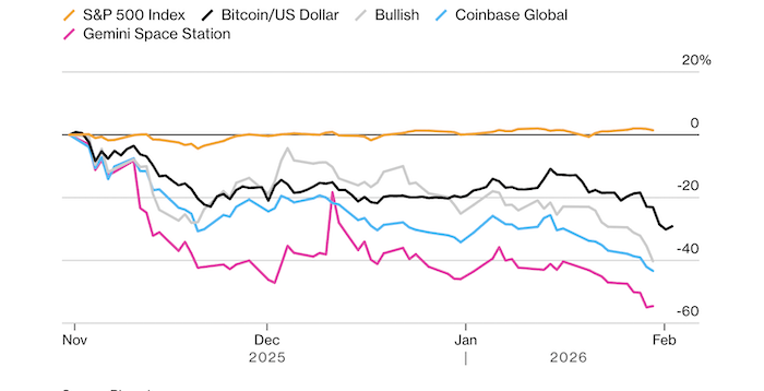 Падение цены биткоина более чем на 35% с октябрьских максимумов само по себе болезненно, для крупнейших бирж, таких как Coinbase, Gemini и Bullish, однако на этот раз удар оказался гораздо сильнее. Их основной источник дохода — торговые объёмы — резко сокращается. Это привело к падению цен на их акции на 40–60% за последние три месяца.