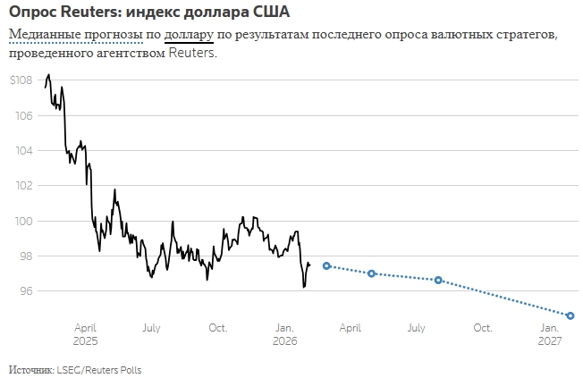 С момента вступления Дональда Трампа в должность президента США чуть более года назад, доллар потерял около 11%. Его неоднократные призывы к значительному снижению процентных ставок, а также недавнее заявление о безразличии к ослаблению доллара ускорили его падение. Индекс DXY частично восстановился после того, как Трамп выдвинул кандидатуру Кевина Уорша, бывшего члена совета управляющих ФРС, на пост председателя. Этот выбор многие расценили как потенциальный шаг к снижению процентных ставок в этом году, по сравнению с другими кандидатами.