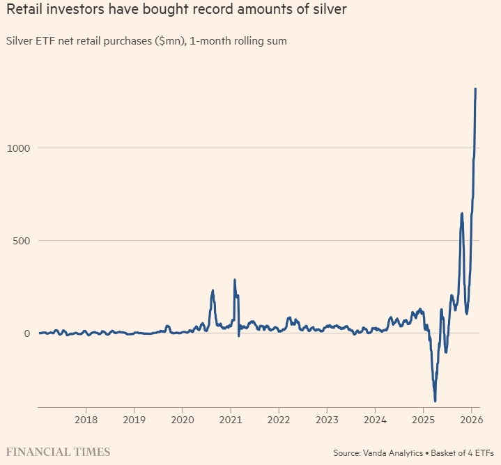Розничные инвесторы, особенно в Азии, стали основным драйвером роста цен в последние месяцы. По данным Vanda Research, в январе индивидуальные трейдеры вложили рекордные 1 млрд долларов в биржевые фонды серебра, что привело к резкому падению цен.