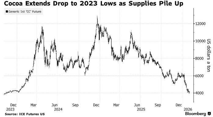 Фьючерсы на какао продолжили падение и достигли самого низкого уровня с ноября 2023 года из-за трудностей с поиском покупателей для продукции ведущих производителей.