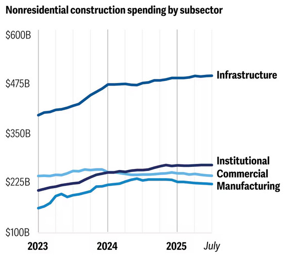 S&P Global ожидает стабильных расходов на строительство инфраструктуры на ключевых рынках, включая США, Европу, Австралию, Канаду и развивающиеся экономики, такие как Индия, Саудовская Аравия и Сингапур. Прогнозируется, что в 2025 году инфраструктурное строительство будет расти быстрее других сегментов нежилого строительства и увеличится на 9,4%. В этом сегменте значительный рост ожидается в секторах транспорта, водоснабжения и канализации с темпами роста на уровне 10% в 2025 году.