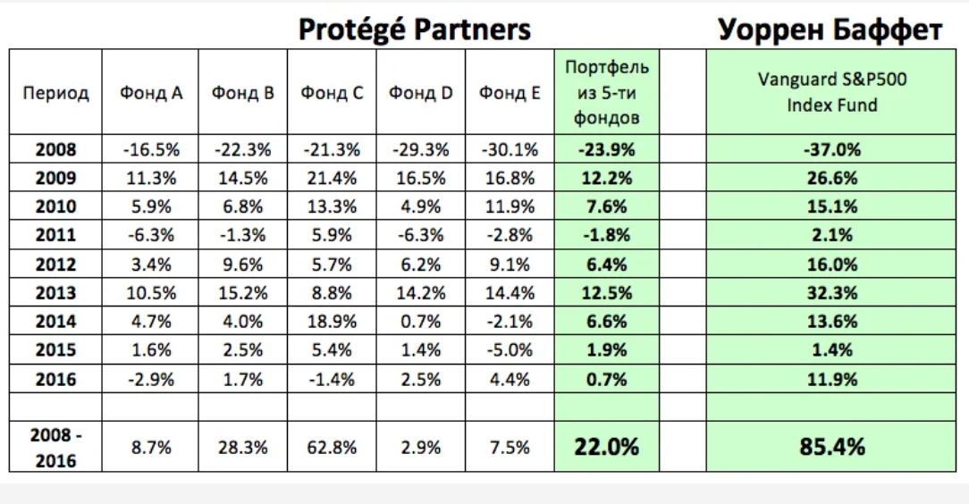 Ну и теперь переходим к итогам этого пари. Вот данные по доходности Баффета и пяти хэдж фондов.