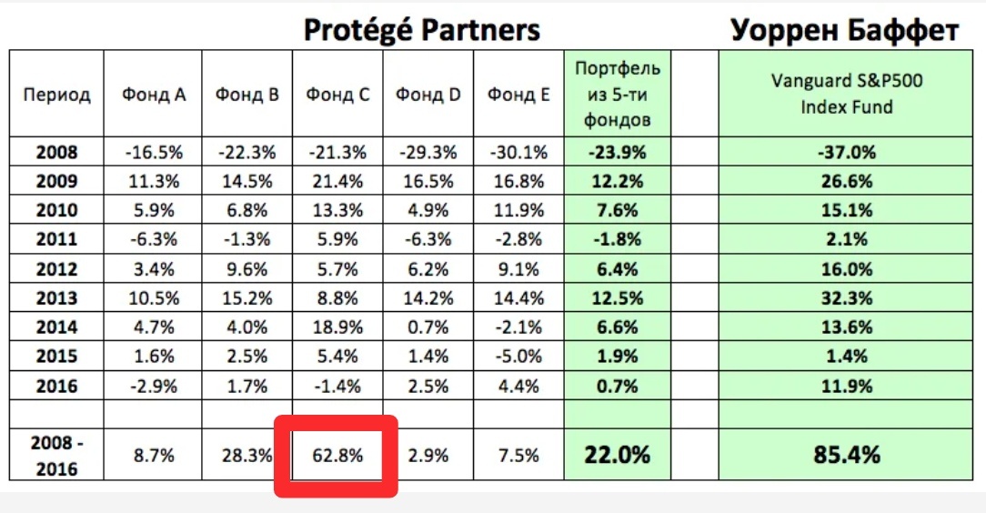Ни один из них не обогнал индекс. За эти 10 лет S&P 500 вырос на 85% и такую же доходность показали инвестиции Уоррена Баффета. А лучший из 5 фондов показал только 62,8% доходности. Соответственно результат остальных ещё хуже.