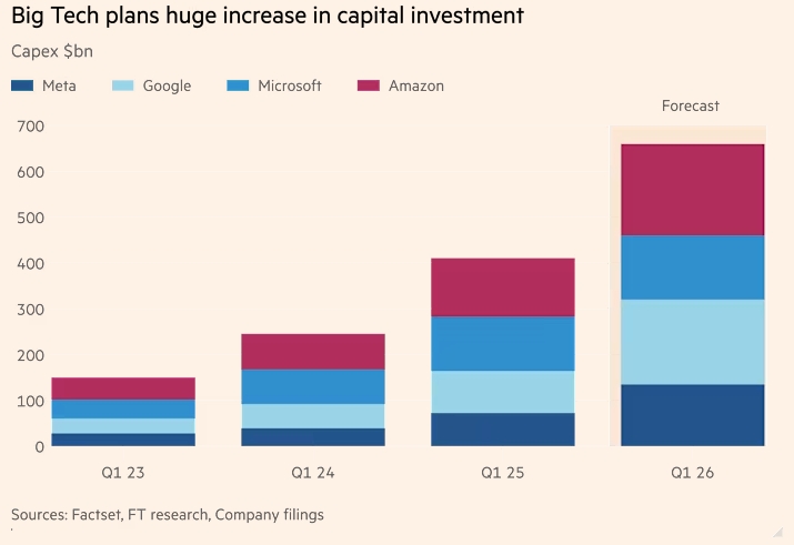 Акции Amazon обвалились на 11% после объявления о планах инвестировать 200 миллиардов долларов в этом году, что на 50 миллиардов превышает ожидаемые расходы. Это превышает уже впечатляющие показатели Google и Microsoft.
