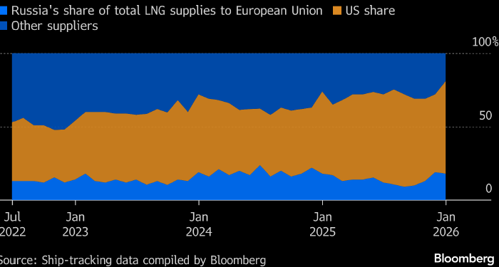 В прошлом месяце свыше 80% всех поставок СПГ в ЕС пришлись на США и Россию, пишет агентство. Эта цифра разительно контрастирует с ситуацией четырехгодичной давности, когда около половины импорта СПГ пришлись на других поставщиков.