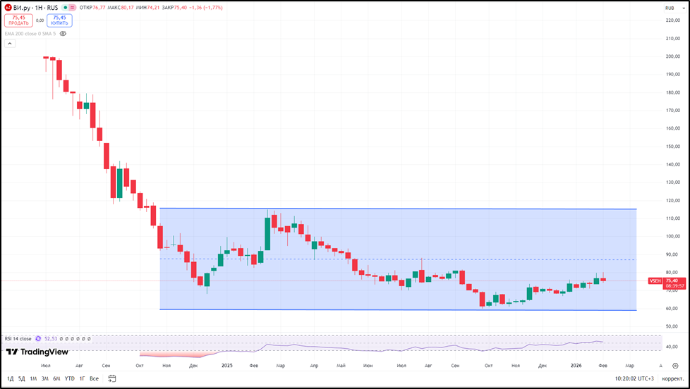 IPO было в июле 2024 года. С тех пор акции упали в 2,5 раза. Снижение за 2025 год составило 13%, не считая дивидендов. Правда, с минимумов сентября 2025 года, котировки прибавили 25%. А с начала 2026 года динамика околонулевая.