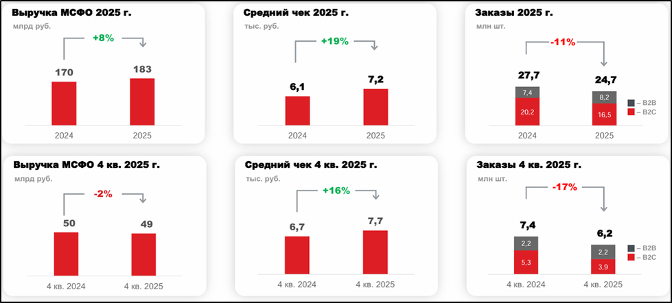 Компания выполнила гайденс по выручке и ЧП, который был представлен в ноябре 2025 года. Выручка выросла благодаря росту среднего чека и общего количества проданных товаров. А значительный рост ЧП – это эффект от выбранной в начале года стратегии операционной эффективности. Компания контролирует денежные расходы и фокусируется на прибыльных сегментах.