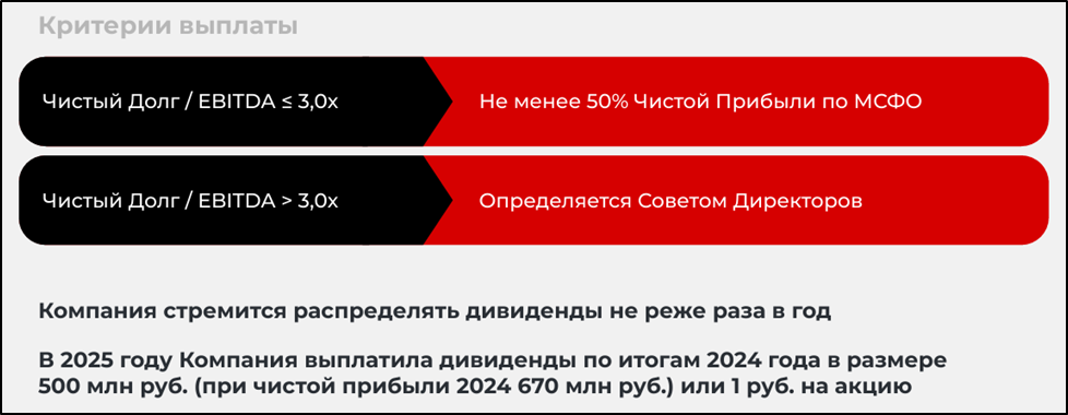 Согласно дивидендной политике, компания стремится выплачивать не менее 50% от ЧП по МСФО в случае, если ND/EBITDA <3.