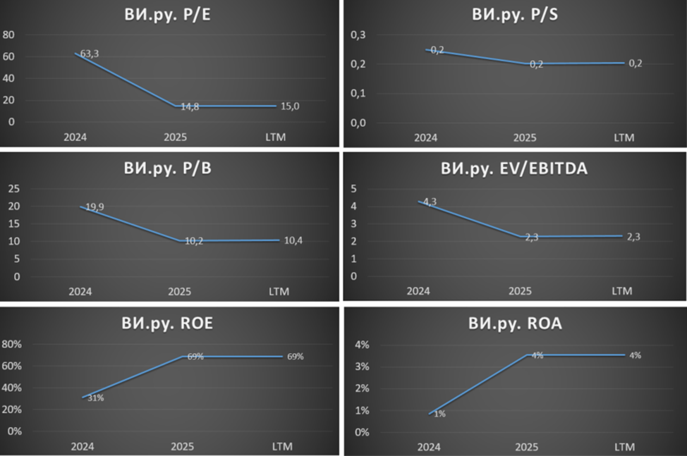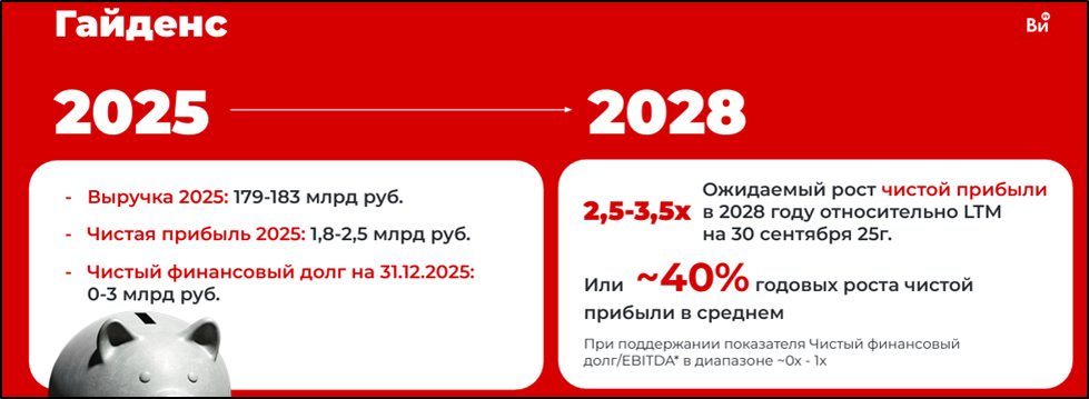По EV/EBITDA компания стоит явно недорого, но при этом P/E = 15. С другой стороны, ВИ.ру позиционирует себя, как компания роста, и если поверить в их гайденс, то fwd P/E 2028 ≈ 5, что явно недорого для такой компании.