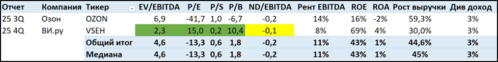 ВИ.ру с некоторой натяжкой можно сравнить с ОЗОН, относительно которого по мультипликаторам он смотрится значительно дешевле. Правда, ОЗОН пока сохраняет высокие темпы роста выручки и на его результаты сильно влияет финтех направление.