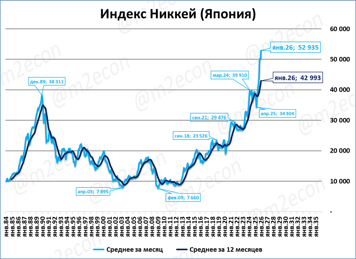 Исторический рекорд 1989 года (38,3 тыс.) был побит только через 35 лет, в 2024 году. Но затем индекс долго держался на отметке чуть ниже 40 тыс. И только сейчас можно сказать, что результат 1989 года не только повторен, но и значительно превзойдён.