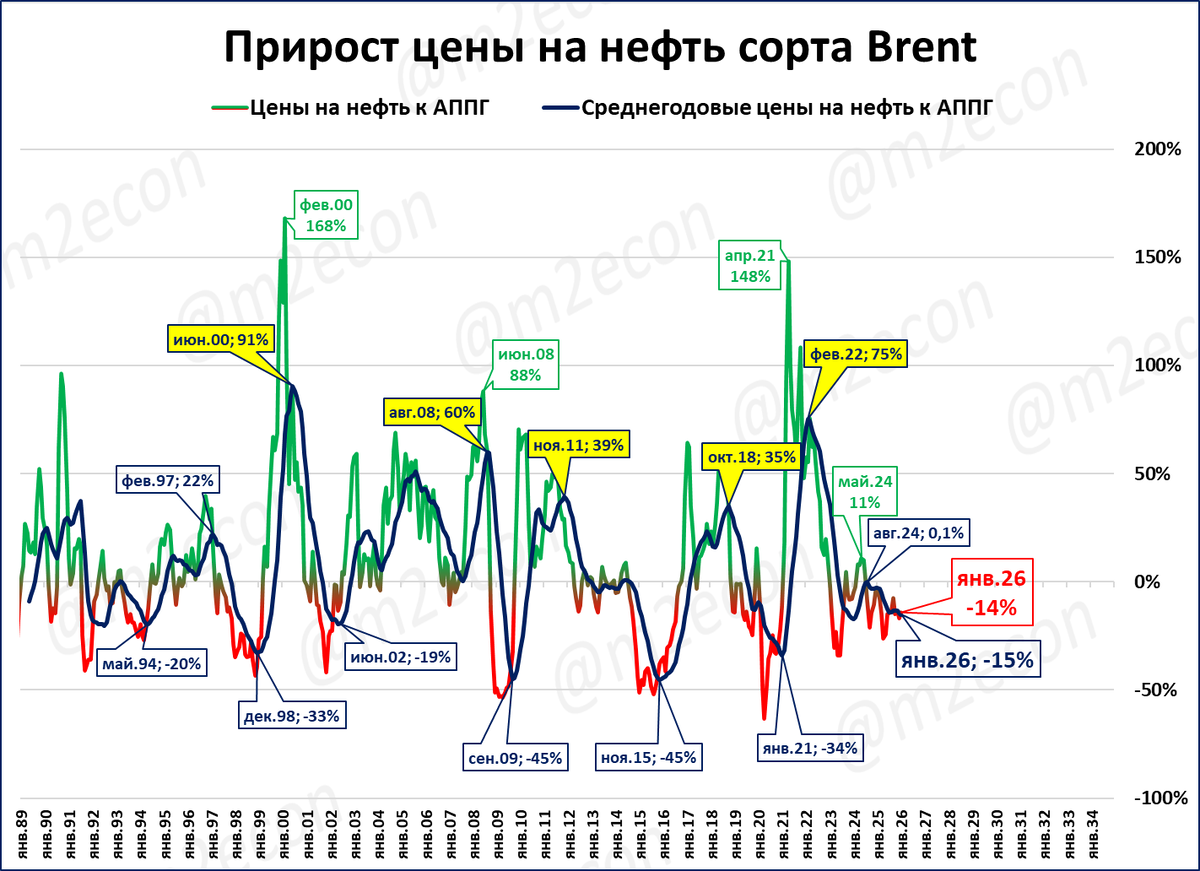 Наблюдение: Фаза снижения нефтяных цен началась в 2022 году и продолжается сейчас.