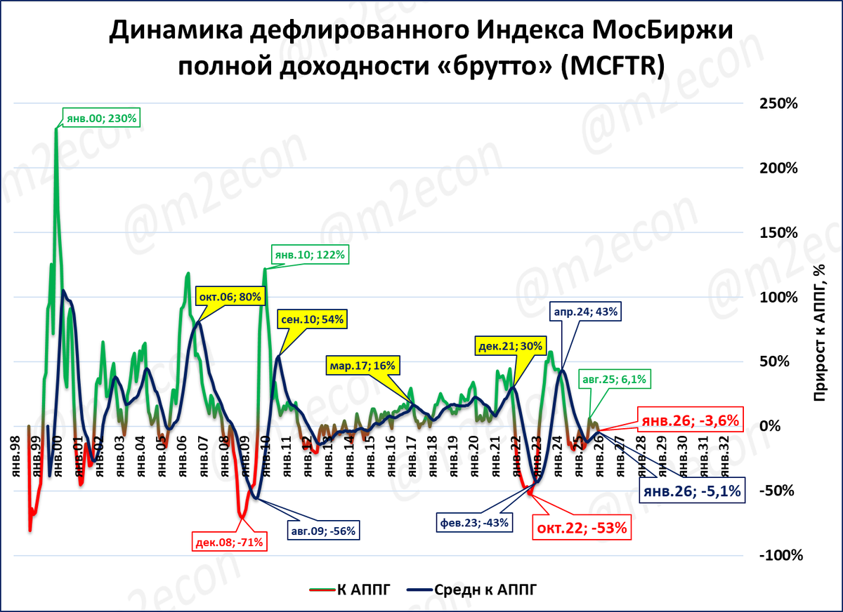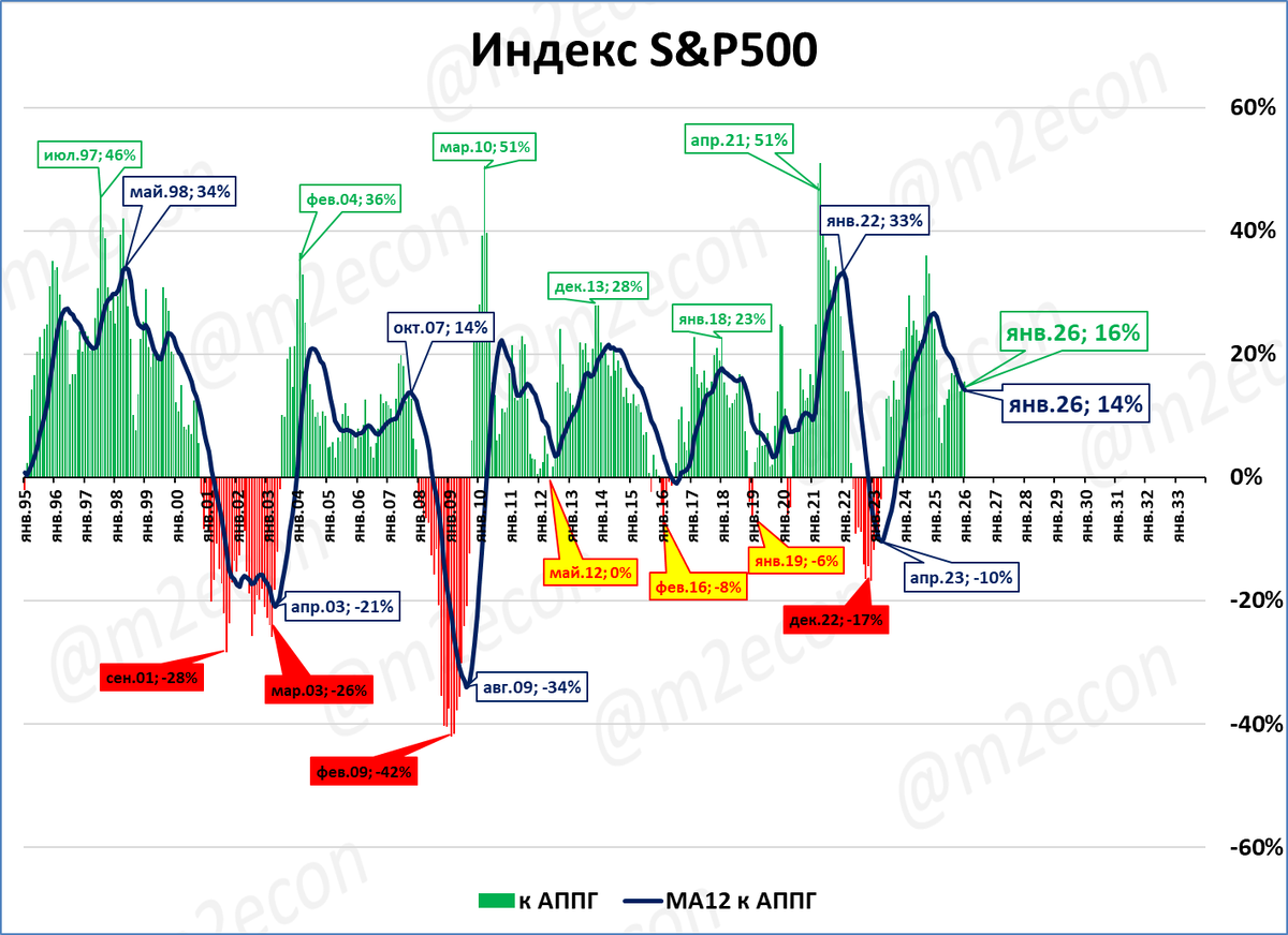 «Медвежьи рынки» (полноценные падения индекса) показаны красными выносками. Визуальный ориентир – красная «борода» и синяя линия ниже нулевой отметки.