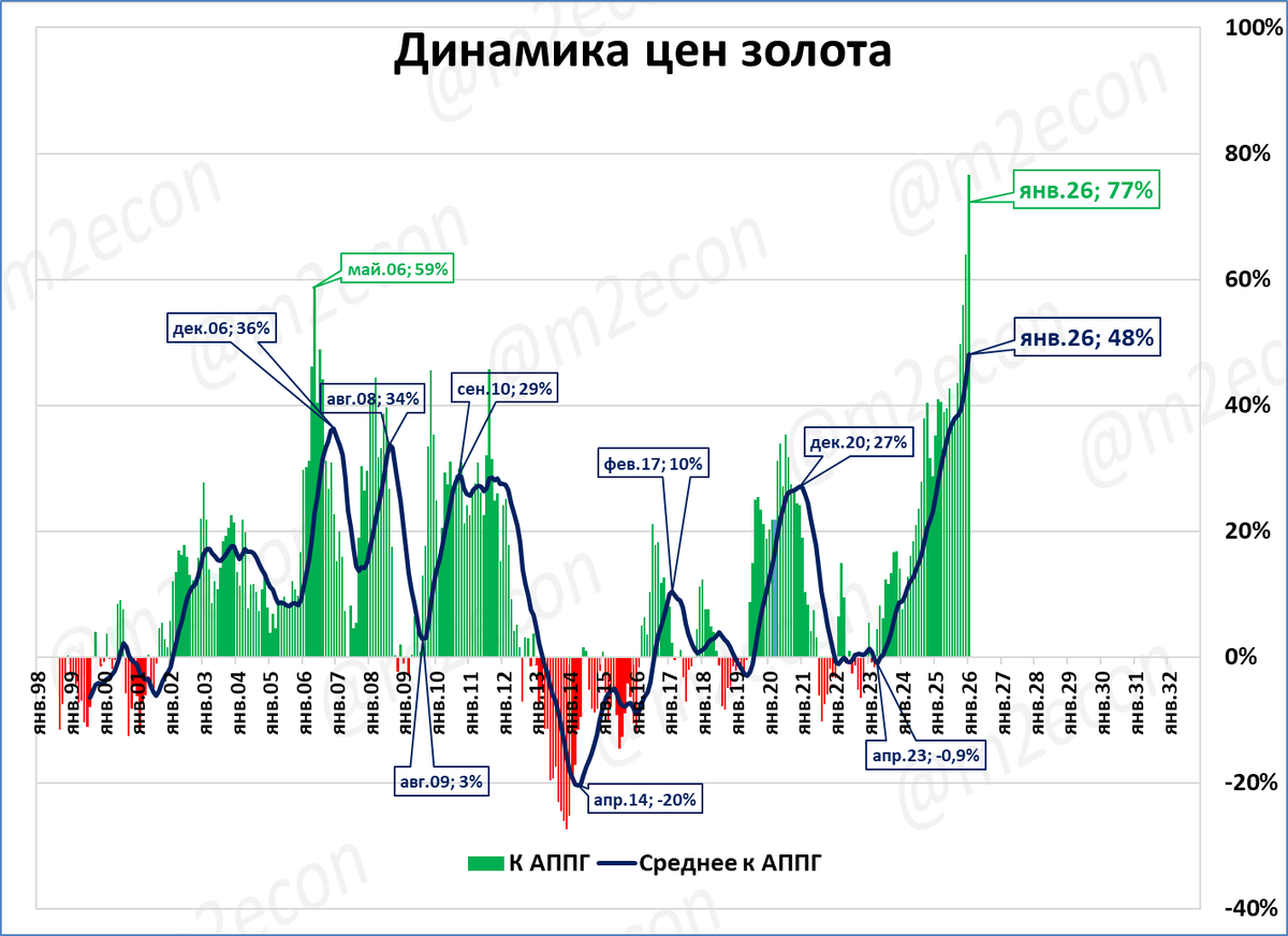 Цены на золото растут. Пока нет даже замедления темпов роста (текущие темпы выше среднегодовых). Рост ускоряется.