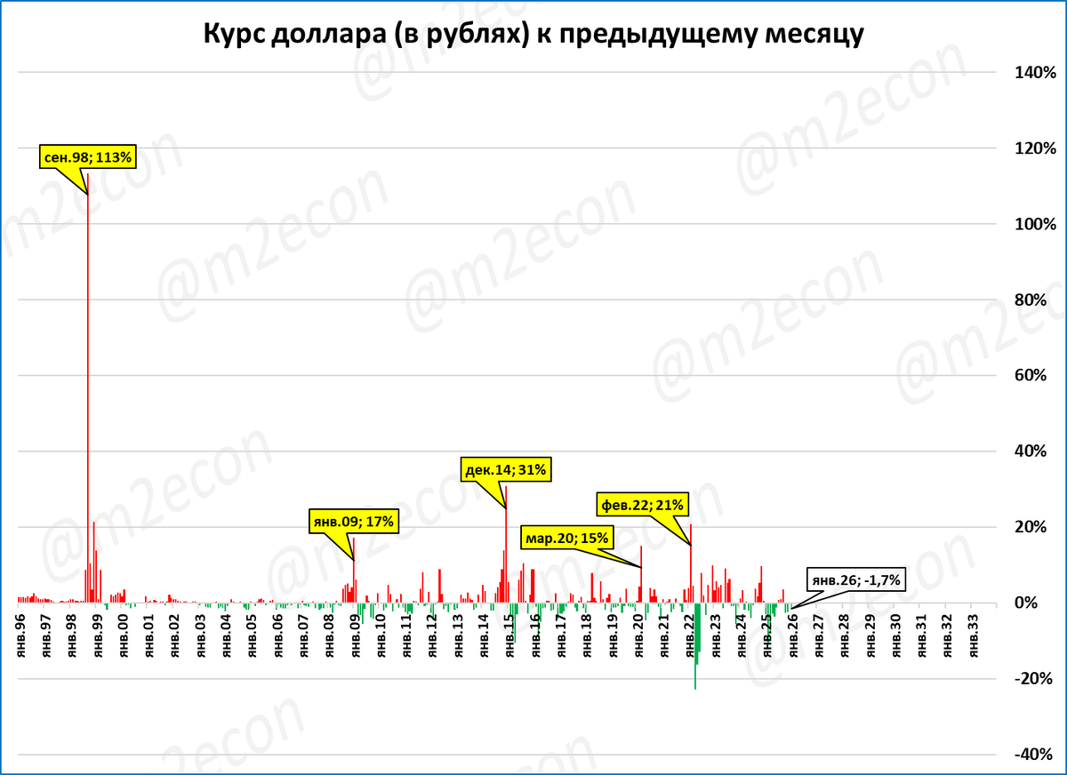 Резкие скачки курса (15% и более к предыдущему месяцу) показаны жёлтыми выносками.