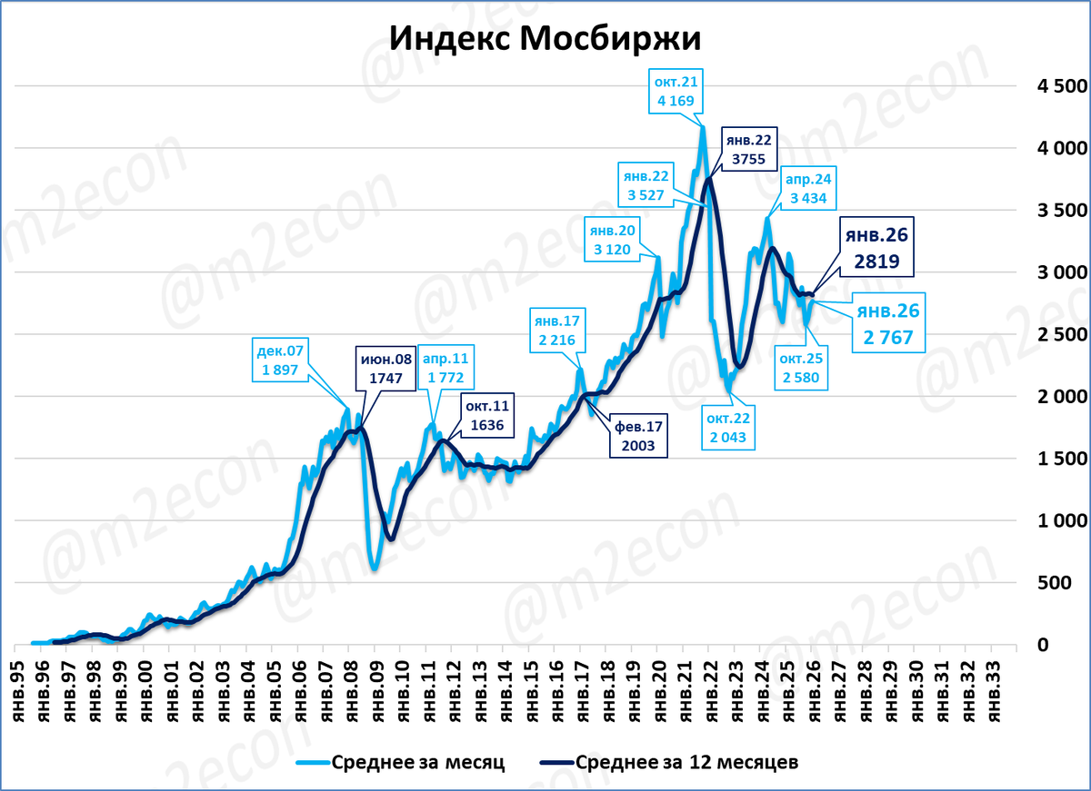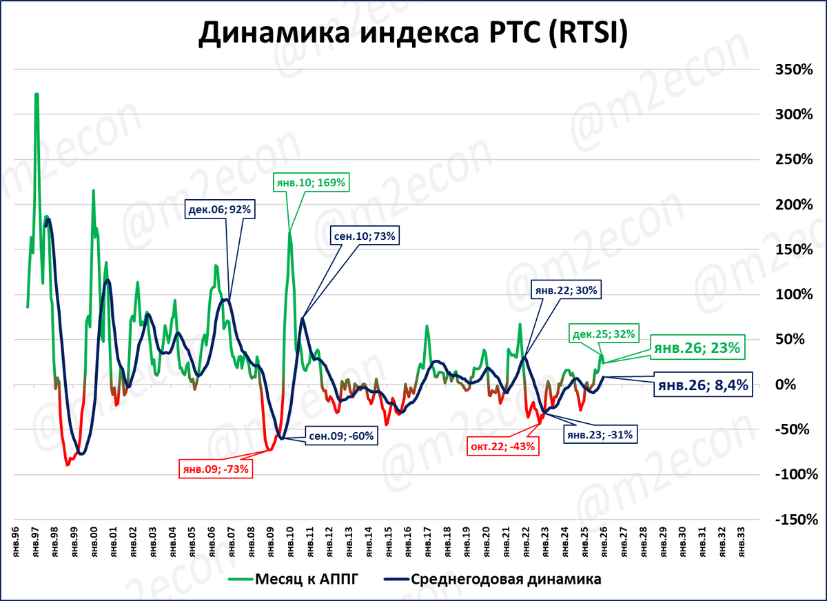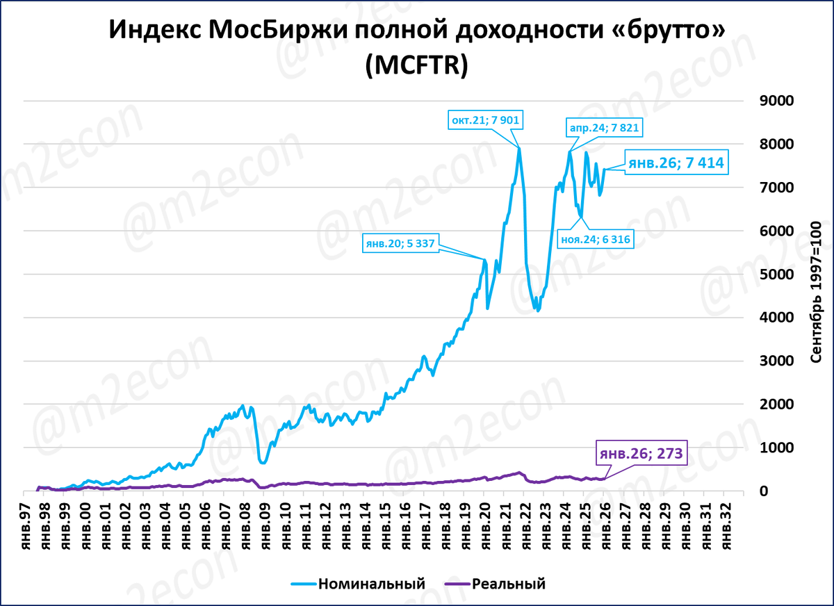 Индекс полной доходности учитывает выплаты дивидендов. По итогам января 2026 года индекс полной доходности вырос в 74 раза с сентября 1997 года (со 100 до 7 414 пунктов; голубая линия на графике). Для сравнения: «стандартный» индекс Мосбиржи вырос «всего» в 28 раз за то же время (около 2 767 п. сейчас против 100 пунктов в начале, см. предыдущий сюжет).