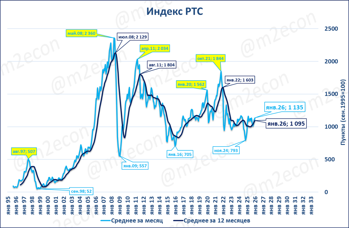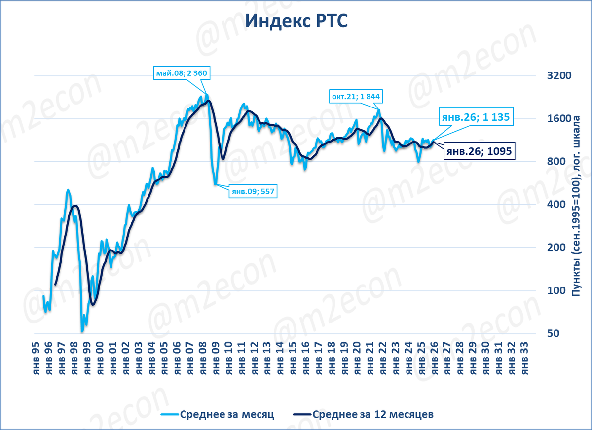 Оценка: индекс РТС показал высокий годовой рост главным образом благодаря низкой сравнительной базе: с августа 2024 по январь 2025 индекс был ниже 1000 пунктов (см. первый график в сюжете), в том числе из-за ослабления рубля.
