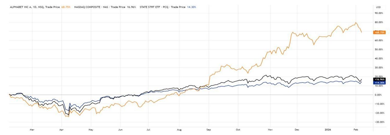 Ребазированная динамика акций Alphabet и индексов S&P 500 и NASDAQ