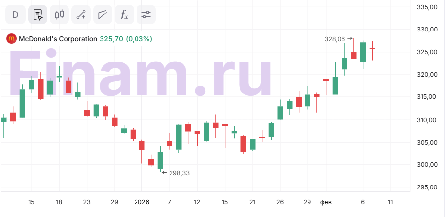 McDonald’s опубликует отчетность за четвертый квартал и 2025 год после закрытия рынка 11 февраля. Консенсус-прогноз предполагает рост выручки на 7,1% г/г до $6,8 млрд и скорректированную прибыль в $3,04 на акцию (+8,4% г/г). Бумаги компании торгуются у годового максимума, на фоне роста на 6% за последний месяц благодаря перетоку капитала инвесторов в защитные истории на фоне волатильности в технологическом секторе США.