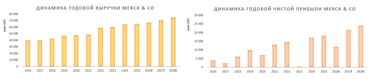 В 2025 году Merck продолжила демонстрировать положительную динамику ключевых финансовых показателей — выручка компании достигла $65,0 млрд (+1%), а чистая прибыль составила $18,3 млрд (+7%). Несмотря на падение продаж вакцины Gardasil/Gardasil 9 на 39% из-за снижения спроса в Азии, общий портфель показал рост продаж. Ключевой драйвер подъема выручки — блокбастер Keytruda ($31,7 млрд, +7%).