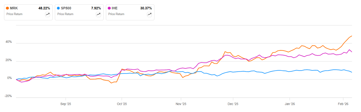 ДИНАМИКА ДОХОДНОСТИ АКЦИЙ MERCK ПО СРАВНЕНИЮ С ISHARES U.S. PHARMACEUTICALS ETF И ИНДЕКСОМ S&P 500 YTD