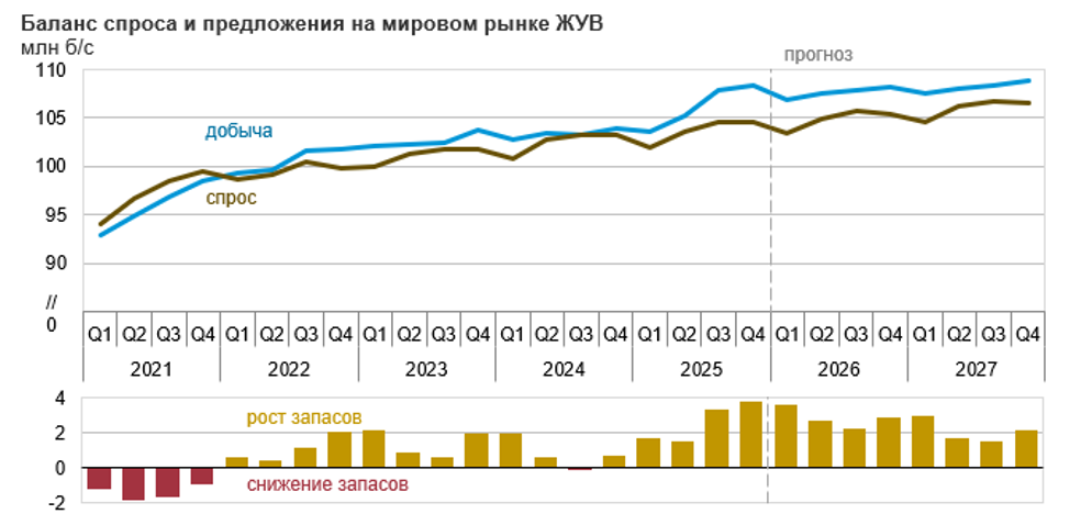 Без геополитических факторов ценам на нефть будет тяжело расти в текущем году из-за ожидаемого профицита. За прошлый год рост квот на добычу ОПЕК+ составил почти 2,9 млн б/с, а также добыча увеличивалась в Гайане и Бразилии. При этом спрос растет более скромными темпами. В среднем ОПЕК, МЭА и EIA ожидает, что в 2026 году он вырастет на 1,1 млн б/с. Сочетание довольно активного роста предложения и более скромного увеличения потребления создают предпосылки для достаточно устойчивого профицита на рынке нефти в 2026–2027 гг. Частично он будет компенсироваться восполнением стратегических резервов со стороны США и Китая, но даже с учетом этого фактора ценам на нефть марки WTI будет тяжело устойчиво подняться выше $65 за баррель.