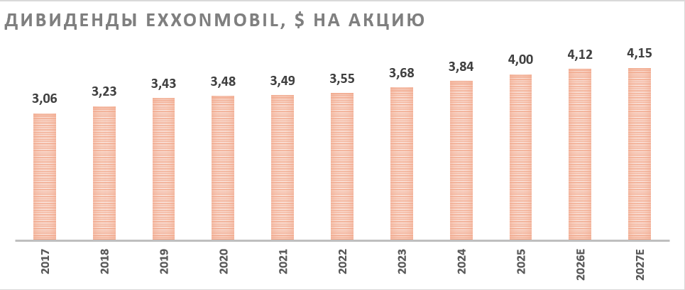 ExxonMobil является дивидендным аристократом и увеличивает выплаты на акцию уже 43 года. Выплаты по итогам 2026 г. могут, по нашим оценкам, составить $4,12 на акцию (2,8% доходности). Кроме того, нефтяник регулярно проводит обратный выкуп акций — при текущей рыночной конъюнктуре его объем может составить около $20 млрд (3,2% доходности), а суммарная доходность выплат акционерам — 6,0%. При этом сейчас часть выплат компания осуществляет в долг из-за недостатка FCF. Если цены на нефть дополнительно снизятся, это может вынудить ExxonMobil сократить темпы байбэка.