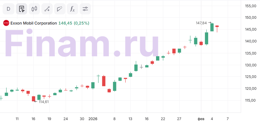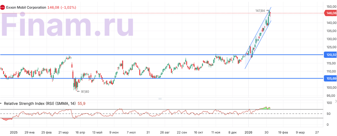 С технической точки зрения на дневном графике акции ExxonMobil торгуются в рамках краткосрочного восходящего тренда. При этом индекс относительной силы показывает высокий уровень перекупленности после непрерывного роста, что создает предпосылки для хотя бы локальной коррекции. В случае снижения первой поддержкой будет выступать граница восходящего канала у отметки $140. При этом в сценарии разворота снижение может продлиться до $120–125, т. е. до предыдущего исторического максимума.