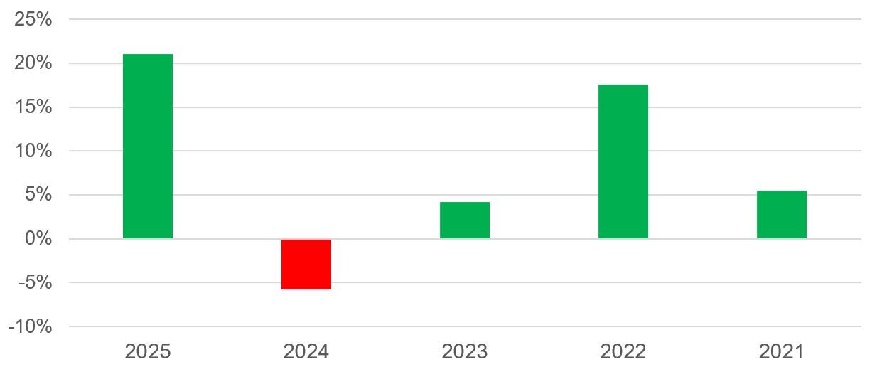 Как и остальной рублевый сегмент, облигации, привязанные к инфляции (линкеры), продемонстрировали высокий результат по итогам прошлого года. Находящийся в нашем покрытии выпуск ОФЗ-ИН серии 52002 принес своим держателям 21,05%, что оказалось на уровне флоатеров и лишь немного уступило гособлигациям с фиксированной ставкой купона. Так, классический выпуск ОФЗ серии 26212, погашающийся примерно в те же сроки, что и инфляционный линкер серии 52002, сгенерировал доход по итогам 2025 года в размере 22,56%.