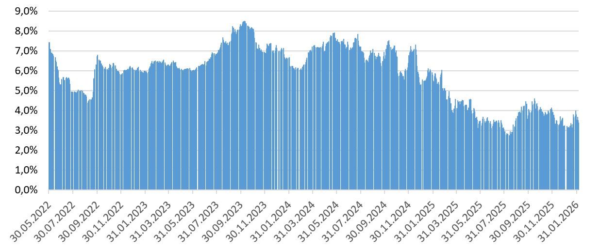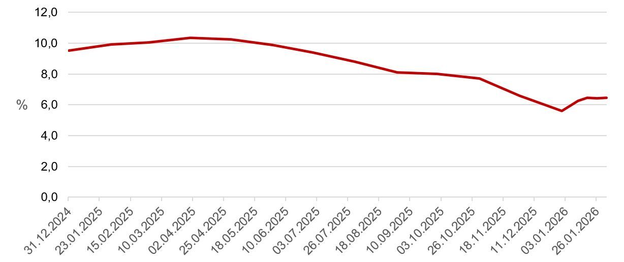 Оживление инфляционной динамики стало одним из заметных моментов первых дней 2026 года. По состоянию на 02.02.2026 годовая инфляция ускорилась до 6,46% с 5,59% на конец декабря 2025 г. Как видно на графике ниже, выраженный прирост инфляции в стране в годовом выражении наблюдается впервые с марта прошлого года.