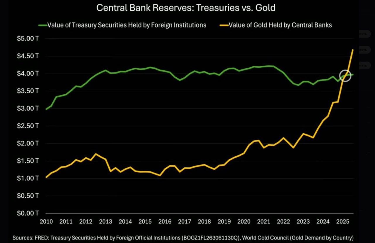 Сейчас стоимость американских долговых бумаг в международных резервах мировых ЦБ опустилась ниже стоимости золота. Такое изменение баланса связано с тем, что цена на золото выросла, а цены на облигации упали. Однако мировые ЦБ уже долго не увеличивали экспозицию по US Treasuries, в то время как запасы в золоте росли. Это означает возможную смену глобального порядка резервирования в мировой финансовой системе, когда идет ротация резервов от активов, зависящих от политической ситуации, к нейтральным активам, и этот переход укрепляет новый ценовой тренд.